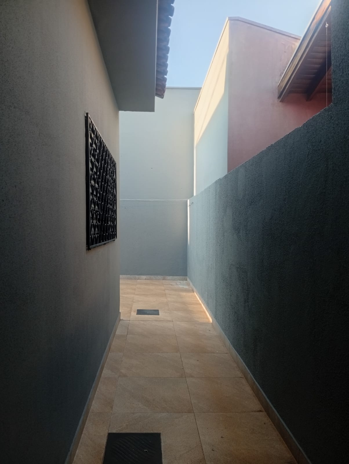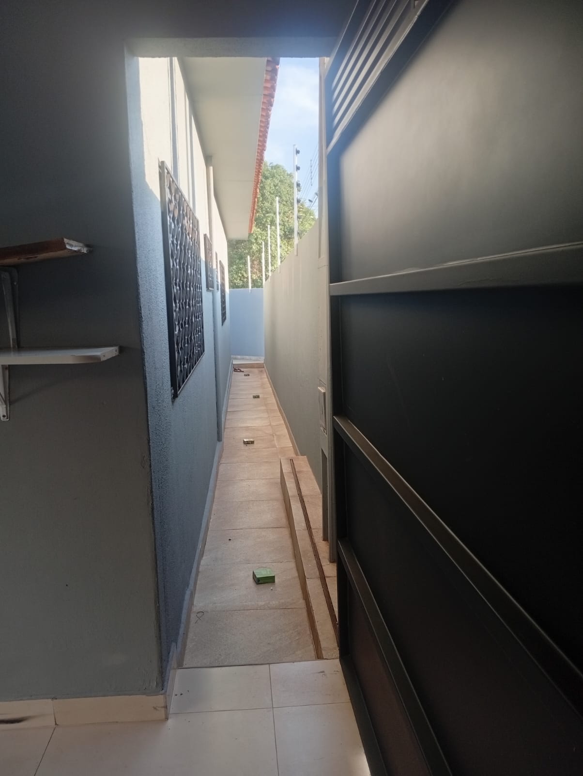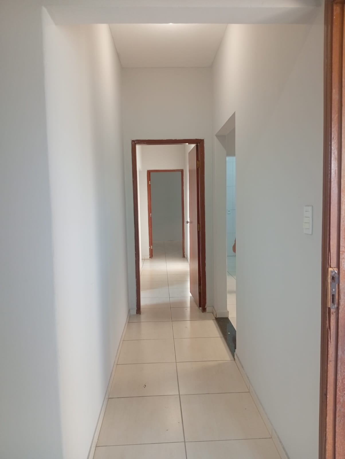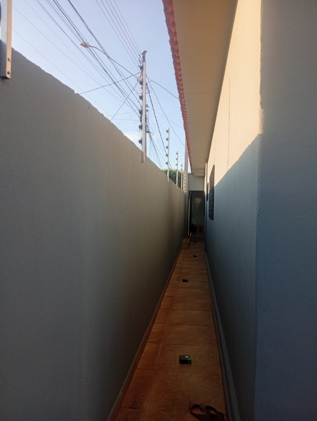 Garagem para 02 carros na frente, garagem para 01 carro no fundo, 01 sala, corredores interno, 01 banheiro social, 03 quartos sendo 01 suíte, 01 copa, 01 cozinha, corredores externos, quintal, 01 área de serviço.
