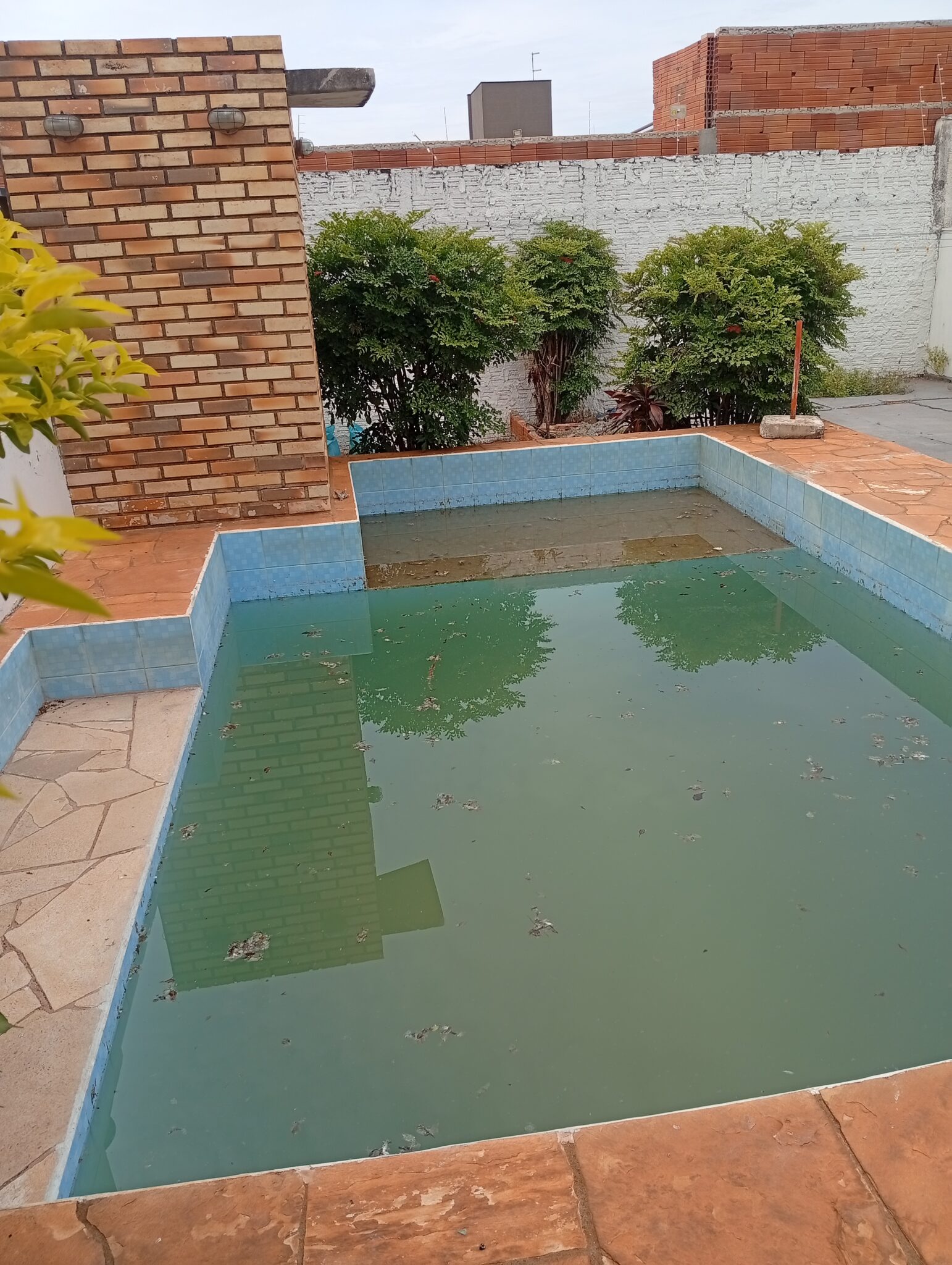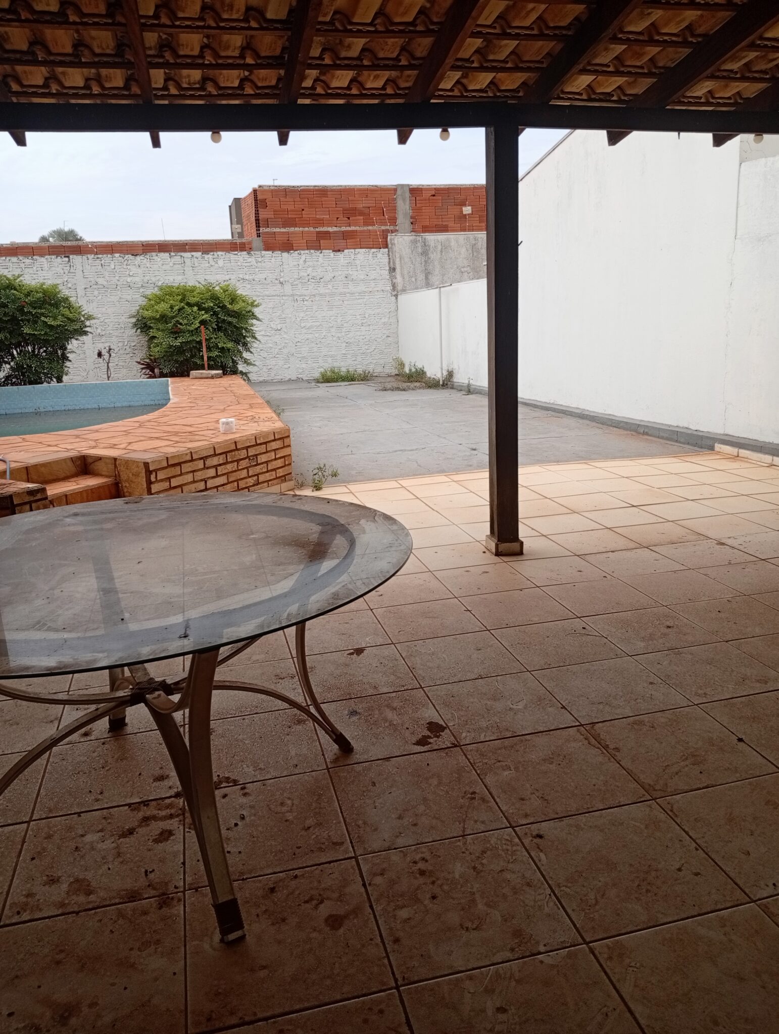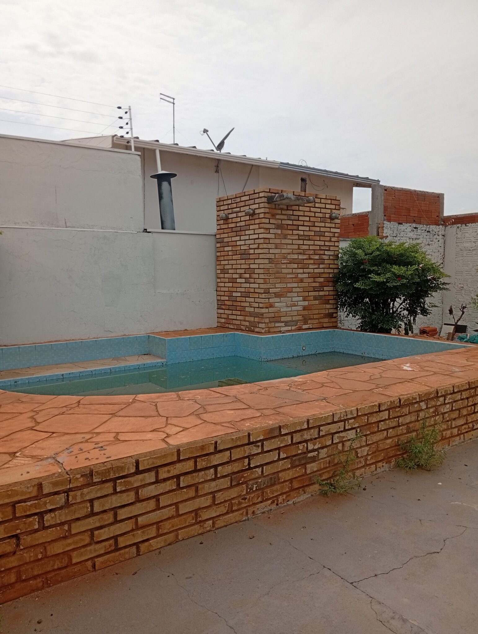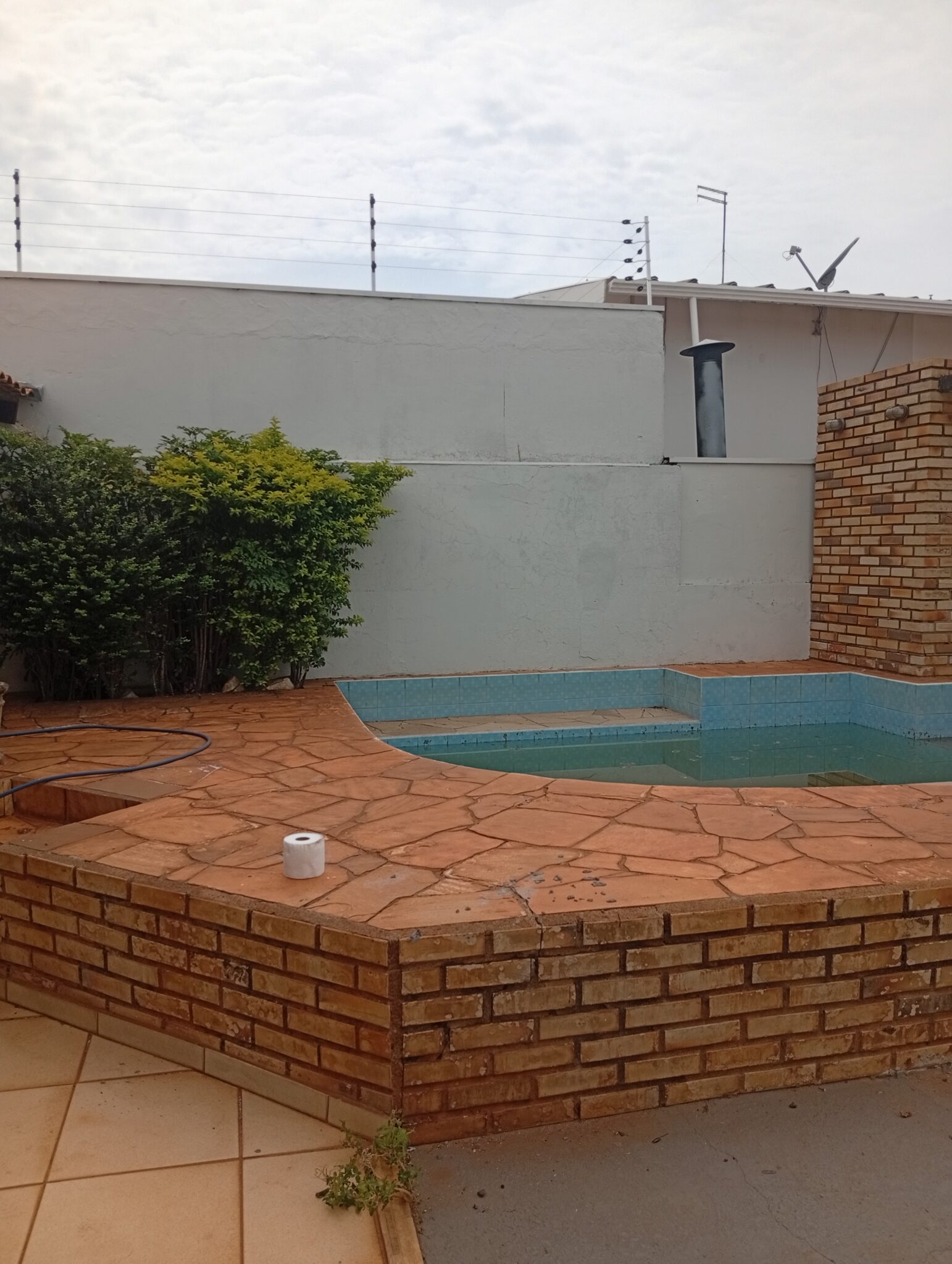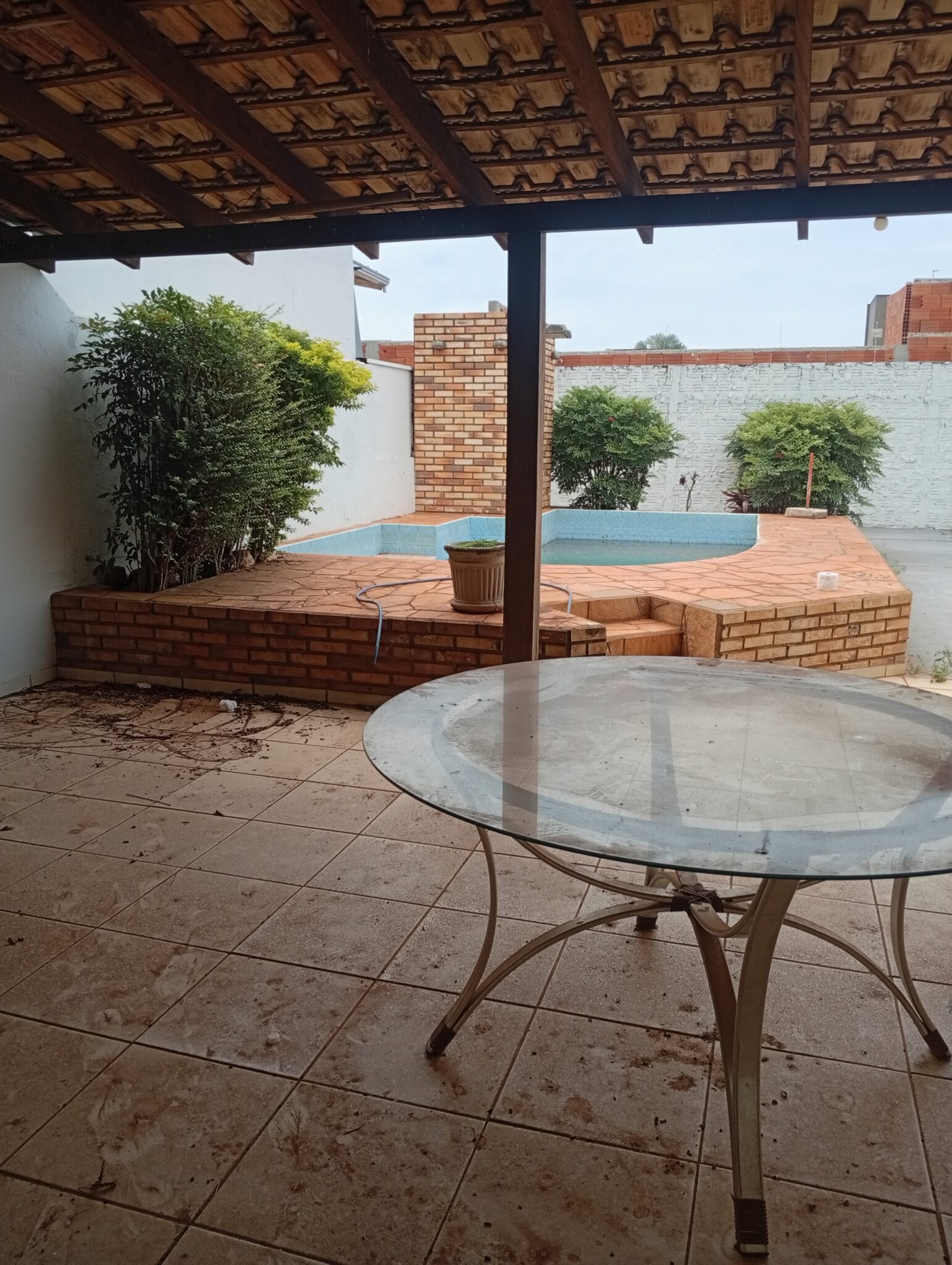 Garagem para 02 carros, 01 hall de entrada, 02 salas conjugadas, 01 banheiro social interno, 03 quartos sendo 01 deles suíte, 01 jardim de inverno, 01 cozinha, 01 dispensa, 01 área de serviço, 01 banheiro externo, 01 varanda, 01 área com uma piscina grande, 01 quintal.